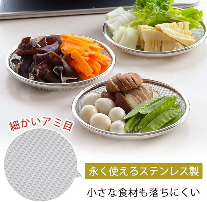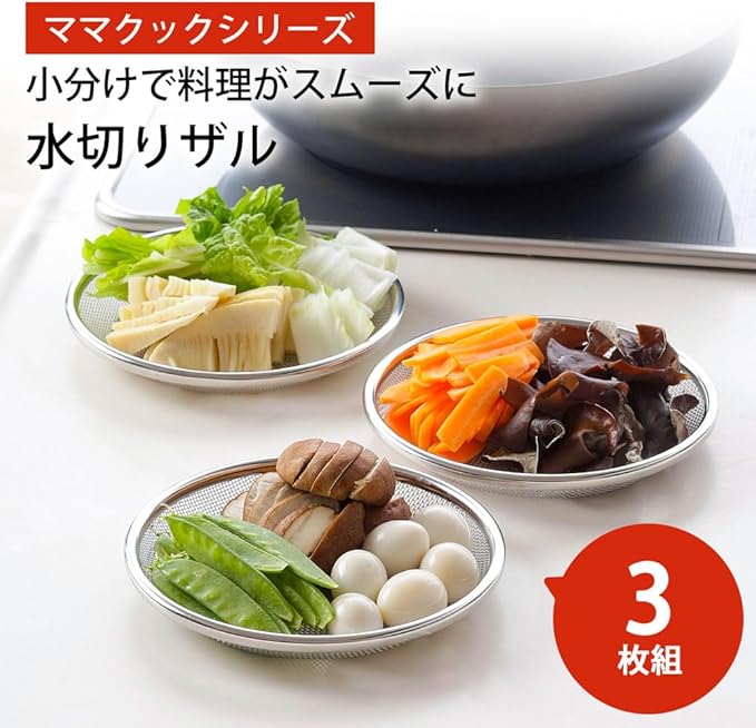 下村企販 ざる 水切り 浅ザル 3枚組 【日本製】 食洗機対応 食材の小分け 下ごしらえに便利 脚付き 平ざる 野菜 ステンレス セット ママクック 43024