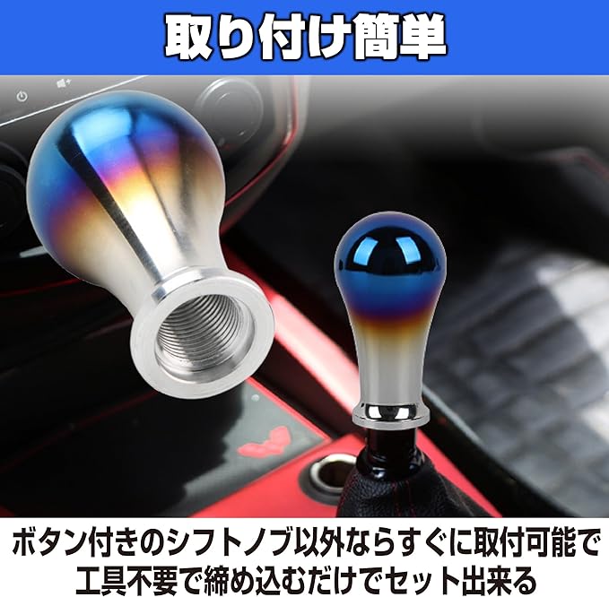 鮮やかなチタンブルーの美しいシフトノブ:こちらは、MT車に対応した汎用タイプのシフトノブです。スポーティーで高級感溢れるチタンブルーカラーで、本体はチタン合金素材を採用しています。鮮やかで華やかなデザインが個性的で、握りやすさもアップします。