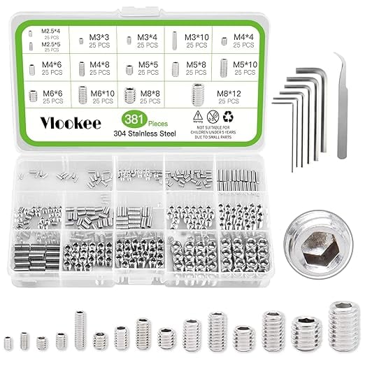 Vlookee イモネジ セット 381個入 六角穴付止めネジ 【正規品60日保証】六角ネジ 304ステンレス鋼 いもねじ M2.5 M3 M4 M5 M6 M8 芋ネジ 人気 父の日のプレゼント 中空スリーブ ボルトベース ヘッドレススクリュー 内側六角 グラブねじ 止めねじ キット ヘックスキーレンチ付属 収納ボックス付き