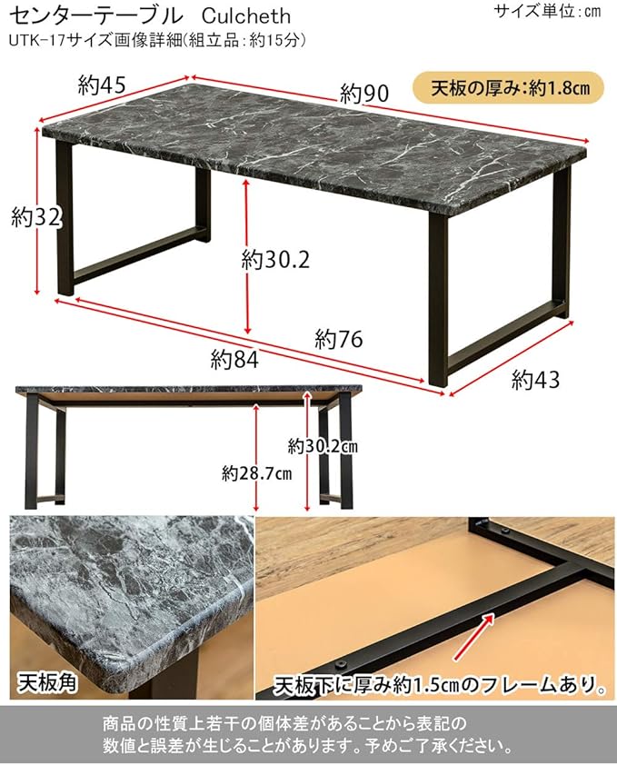 センターテーブル Culcheth ローテーブル 90cm 45cm 大理石柄ブラック UTK-17MBK