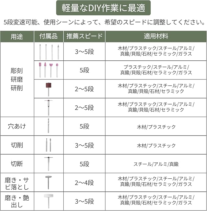 【豊かな付属品】異なる加工材料に対して、適合なアクセサリーを選択し、正確で作業してください。