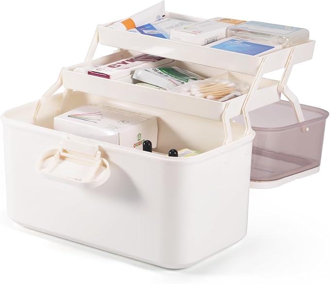 Annhua 救急箱 3段 薬箱 大容量 半透明 プラスチック製 お薬ボックス 薬収納 家庭用 応急ボックス 取っ手付き 持ち運び便利 ベージュ Lサイズ 16奥行きx28.5幅x21高さcm