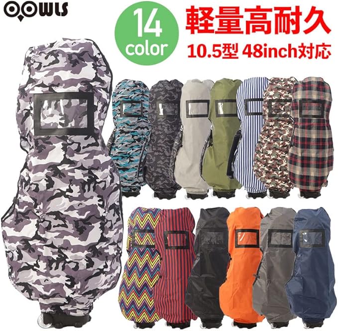 ※パソコンやスマホによっては実際の色と多少異なる場合があります。 【製品仕様】 【OOWLS 軽量高耐久ゴルフバックカバー トラベルカバー】 ・ダブルファスナー採用で被せるだけの簡単装着 ・大学ノートB5サイズまでたためるコンパクト収納タイプ ・宅急便各社対応クリア防水伝票入れ付 ・耐久性と撥水性に優れた、丈夫な厳選ポリエステル素材使用 ・10.5型、48インチ対応のキャディバッグまで対応 ・最下部のマジックテープによりカバーをしっかり固定。地面に擦らずに利用可能。 ・サイドのマジックテープからはハンドルやショルダーストラップを出して便利に持ち運びできます。 品番:JYPRF22TRC 素材:ポリエステル サイズ:132 62cm前後(平置き)10.5型 48インチ対応 カラー:ブラック、ネイビー、オレンジ、グレー、チェック、ブラックカモ、サイケデリック、カモ、ボーダー、ホワイトストライプ,ダークカモ、ブルーカモ、オリーブグリーン、カーキ 製造国:中国