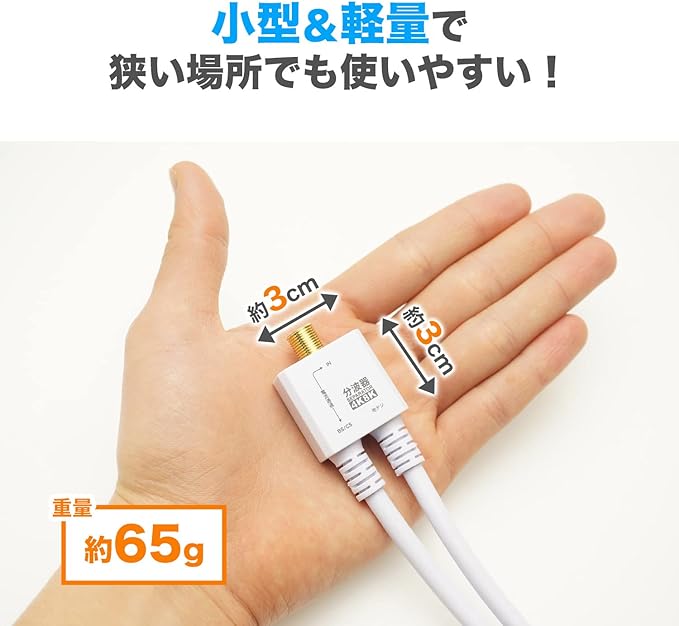 ■地デジ放送、BS/CS放送をそれぞれ視聴したいときはコレ! 地上波(UHF)と衛星波(BS/110度CS)を効率よく分け、1台のテレビで地デジ、BS、110度CS放送を視聴できます。 ■新4K8K衛星放送対応 従来の地デジ、BS、110度CS放送に加えて、最新の4K/8K放送にも対応しています。 ■ケーブル一体型構造 分波器本体と出力側ケーブルが一体型のつくりになっているため、分離型に比べて接続損失を軽減することが可能です。 ■便利なL字差込式コネクタ 狭い隙間での接続にはもちろん、テレビのアンテナ端子位置によっては、配線の露出を防ぐことができ非常に便利です。 ■BSアンテナ電源供給可能 【使用上の注意】 ご使用には入力用のアンテナケーブル(別売)が必要です。