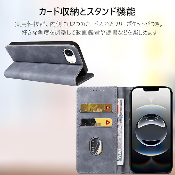 【カード収納とスタンド機能】アイフォン16e カバー動画視聴に便利なスタンド機能が付き、横向いて斜めに立てて、お好きな角度を調整でき、両手が解放され、お気軽に読書やビデオの観賞を楽しむことができます。内側には2つのカード入れとフリーポケットがつき、名刺や定期券の収納に優れているアイフォン 16eケースです