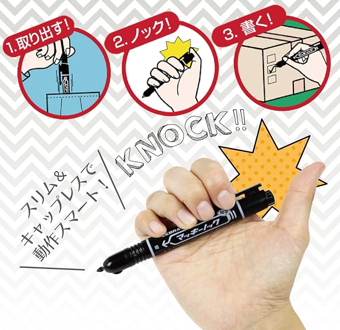 【特長】ノック式の油性マーカー/ワンタッチでスピーディー!スリムで携帯に便利