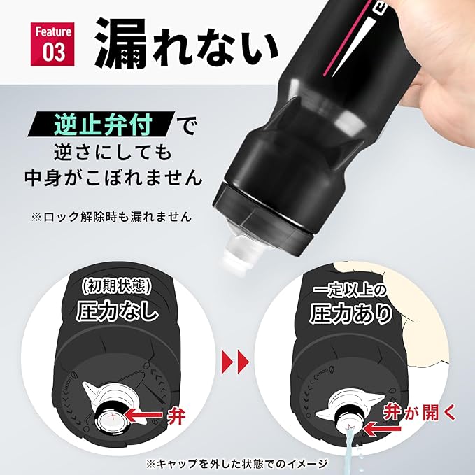 ✅【握るだけの簡単操作】このドリンクボトルは握るだけで簡単に水が出るジェットバルブ式です。ロックを解除しておけば、走行中でもスムーズに水分補給ができ、衛生的な設計となっています。柔らかい素材で作られているため、疲れていても楽に使えるスポーツボトルです。さらに、ボトルを逆さにしても漏れないため、安心して使えます。