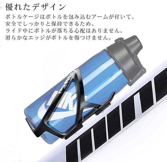 【優れたデザイン】ボトルケージはボトルを包み込むアームが付いて、安全でしっかりと保持できるため、ライド中にボトルが落ちる心配はありません。また、前三角が狭いフレームでもトップチューブに干渉しないよう、斜めに取り出せるよう設計しています。ボトルを素早くストレスなくて取り出す可能です。