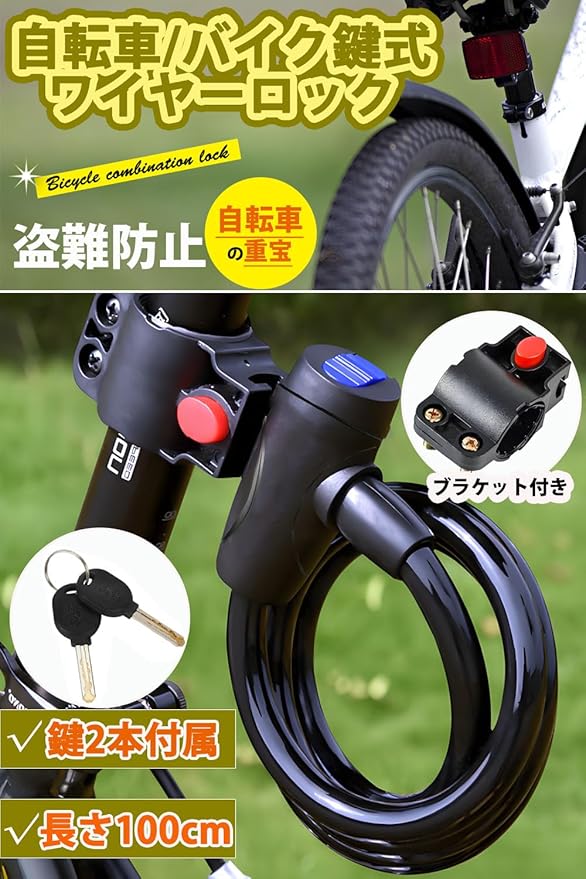 [Fieekty]自転車 鍵 バイク ロック 鍵式 ワイヤーロック 長100cm 3cm 防犯 高切断対抗 頑丈設計 鍵2本付属 盗難防止 専用ブラケット付き ブラック