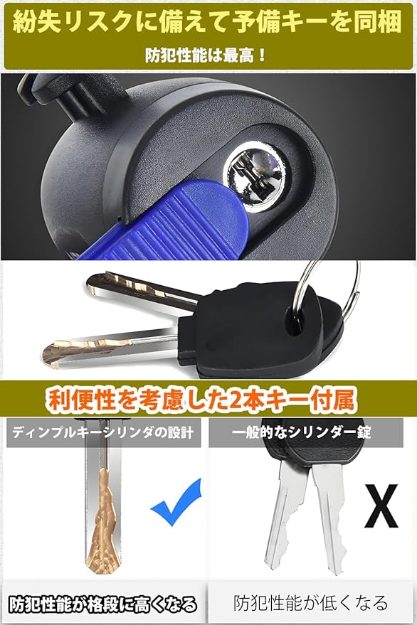 ✅【利便性を考慮した2本キー付属】紛失リスクに備えて予備キーを同梱。シリンダー部には防錆加工を施し、スムーズな施錠/解錠が可能。鍵穴形状を複雑化することでピッキング防止にも配慮しています。新たにアップグレードされたディンプルキーシリンダは、従来の普通鍵よりも防犯性能が格段に向上しています。