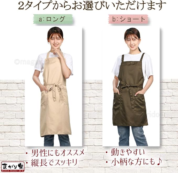 【バリエーション】◇身長(丈)に合わせて、「ロング」「ショート」の2タイプからお選びいただけます ◇ロング丈とショート丈があるので、男女お揃い、親子お揃いが可能です ◇レストランやカフェの飲食業、エステや介護などのユニフォームにも2サイズでお洒落にそろえる事が可能です