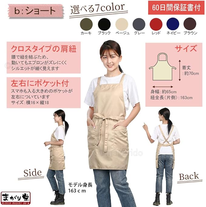 【b:ショートタイプ詳細】◇X型タイプ(たすき掛けタイプ) ◇素材:綿 ポリエステル ◇カラー:全7色 ◇寸法:長さ(紐を除く着丈)約70cm、幅約65cm、紐全長(片側)163cm