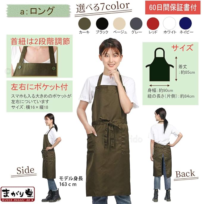 [まがり堂] ほそ見えスッキリ!シンプルエプロン(丈が選べる2タイプ)【ショート/カーキ/深緑色】(男女兼用フリー)