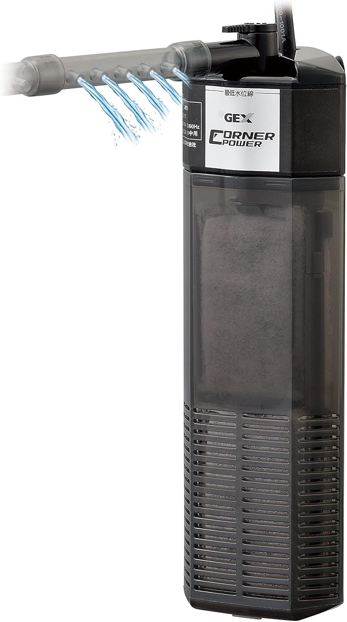 【5つの機能】1.静音設計 水中モーターで動作音が静か。※当社エアーリフト式フィルターとの比較。2.縦・横自由設置 水槽のレイアウトや魚種に合わせて設置方法が選べる。横置きにすれば水深の浅いカメ水槽にもぴったり。3.シャワーパイプで水流をつくる シャワーパイプを使用して溶存酸素量UP。ゆるやかな水流をつくる。4.コーナーだから水槽内ひろびろ コーナーにぴったりフィットするので、水槽内をひろびろ使える。魚が隙間に入らず安心。ワンタッチで取り外し簡単。5.底面フィルターと接続可能 付属のパーツを使用してGEX「マルチベースフィルター」と接続しろ過能力を更にアップ。