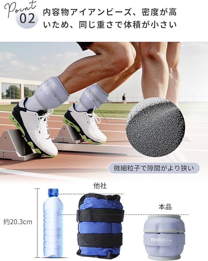 【薄型設計で脚にフィット、運動中もぐらつかない】(5つの小型砂袋で均等分散)重量が分散されるため、一体型のサンドバッグのように滑動せず、ランニングやスクワット時も安定。(高密度鉄砂)通常のサンドバッグより体積30%削減、パンツの下に着用しても目立ちにくい。(二重防漏設計(縫製+内袋))激しい動きでも砂漏れなし。