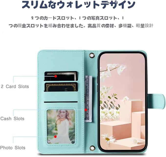 【高品質素材及び設計】大切なスマホを守る安心の手帳型。内部は衝撃吸収性に優れたTPU素材を採用して、落下時の衝撃を効率よく吸収するようにケース の各コーナー内側が設計されています。手触りが良く、キルティングの設計は控えめでエレガントです。