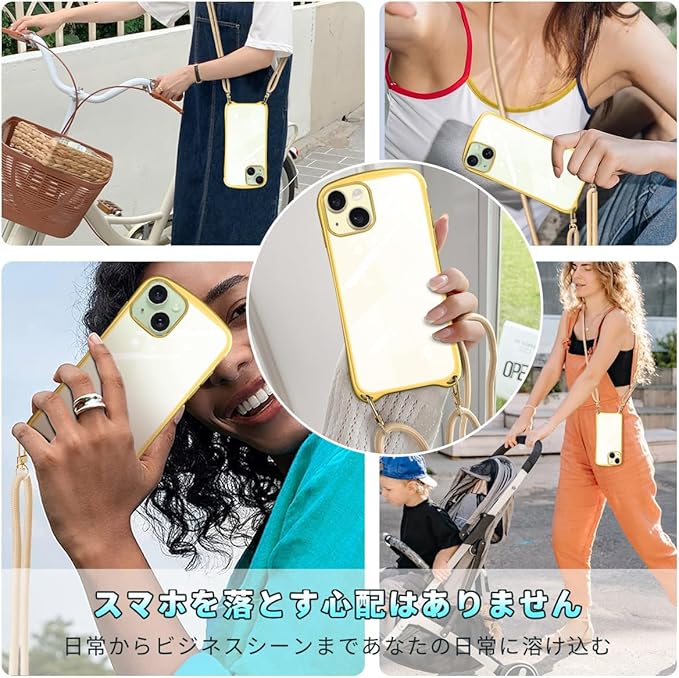 Yidahe iPhone 15 用 ケース クリア ショルダー ストラップ付き アイホン15 カバー iPhone15 用 カバー 透明 肩掛け 縄掛け 斜めかけ TPU メッキ加工 耐衝撃 全面保護 薄型 韓国 可愛い iPhone15 用 6.1インチ 対応 スマホケース (ゴールド)