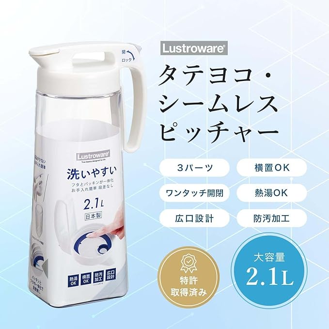 サイズ:幅15.2 奥行10.3 高さ30.5cm、容量:2.1L、材質:本体=AS樹脂、フタ=ポリプロピレン・エラストマー、中栓・ロックボタン=ABS樹脂、電子レンジの使用:不可、食洗機の使用:不可、入数:2個、生産国:日本