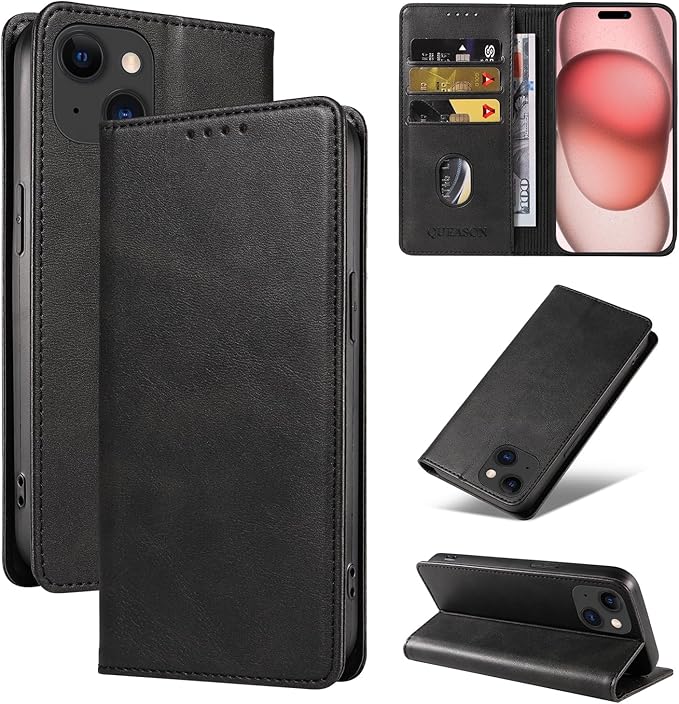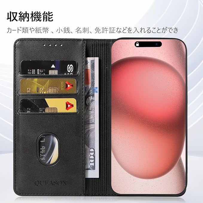 QUEASON 互換品 スマホケース【iPhone 15 ケース 手帳型】iphone15 ケース 携帯ケース いphone15 ケース 手帳型 スタンド機能 アイフォン15 ケース 手帳型 アイホン15ケース 手帳型 薄型ケース カード収納 落下防止 マグネット式 耐衝撃 肌触り良い 全面保護 防塵(ブラック)