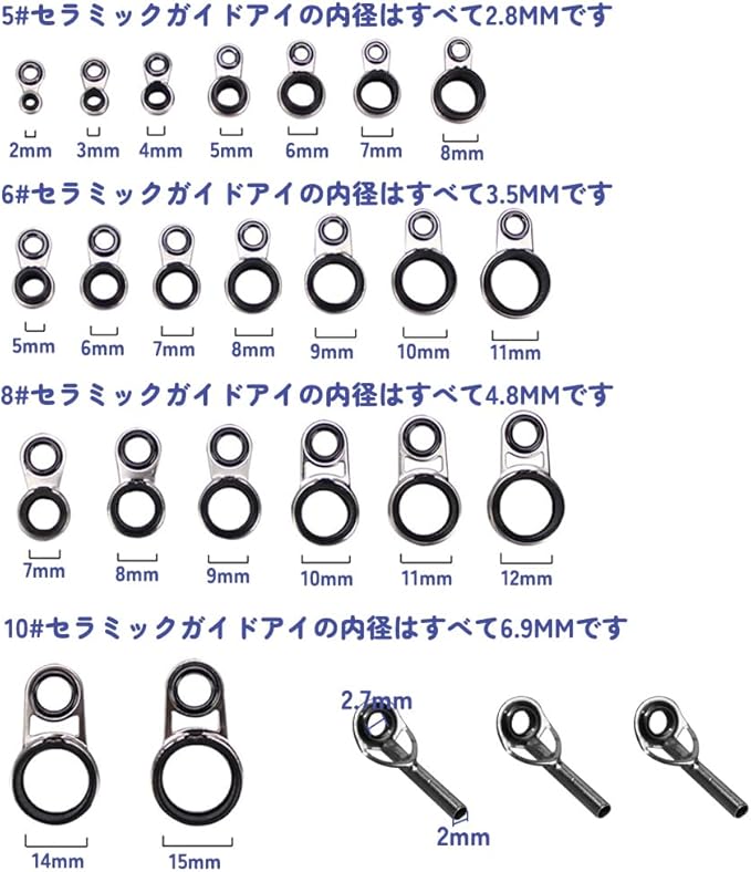 【商品仕様】ラインリングアイの直径サイズ:2.8mm(取付穴の直径:2/3/4/5/6/7 / 8mm);3.5mm(取付穴の直径:5/6/7/8/9/10 /11mm);4.8mm(取付穴の直径:7/8/9/10/11/12mm);6.9mm(取付穴の直径:14/15mm)。トップリングガイドアイを3個プレゼント。