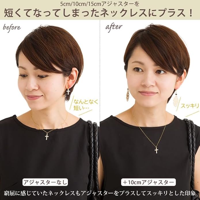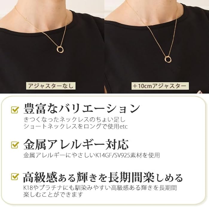 華奢で細いチェーン(チェーン幅約1.1mm)を使用しているのでお手持ちの華奢なネックレス(ベネチアンチェーンなど)のデザインを邪魔することなくチェーンの長さを延長することができます。