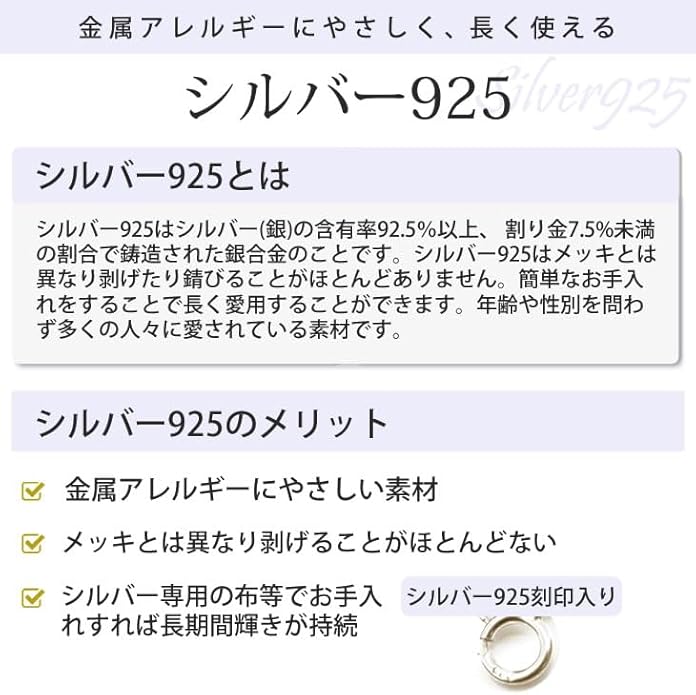 素材:SV925(シルバー925) 金属アレルギーにやさしい素材、ニッケルフリー