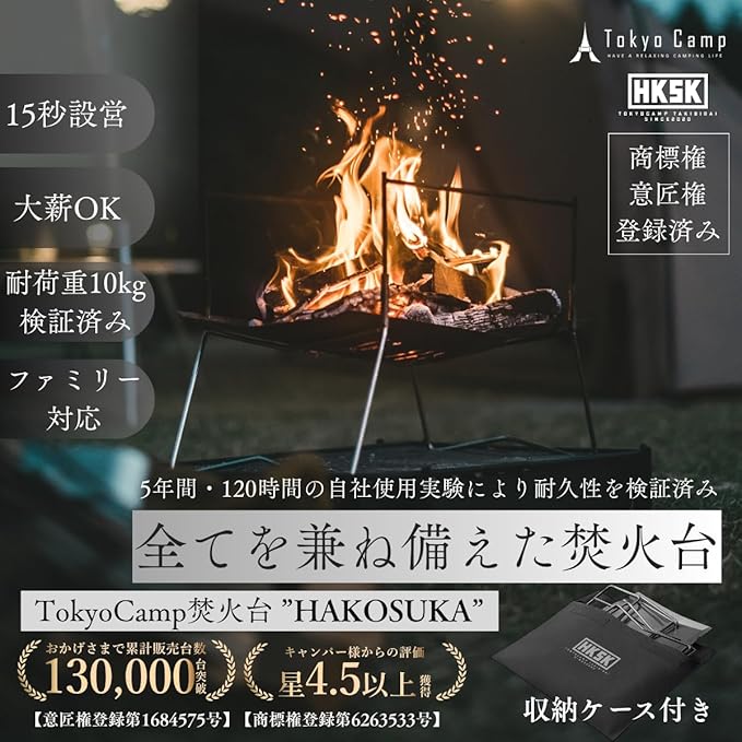 【シリーズ累計13万台突破・レビュー平均4.5】 TokyoCamp焚火台は、累計販売13万台以上、レビュー総数8,800件超・平均評価4.5を獲得。ユーザーの声を反映し進化を重ねてきた、TokyoCampを象徴する定番モデルです。
