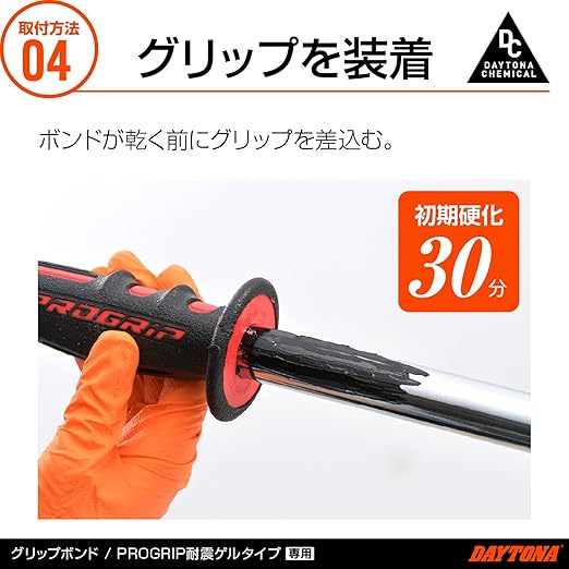 ゲルグリップ対応! 黒いグリップに使用した際に、はみ出したりしても目立ちにくい。当社が取り扱うPROGRI P 耐震ゲルグリップ専用接着剤。グリップ表面を溶かす心配が無く、硬化後も柔軟性のある接着面を形成するため、振動による割れやはがれがなく、しっかりと固定できます。初期硬化30分、完全硬化24時間。使用可能温度:MAX85℃。