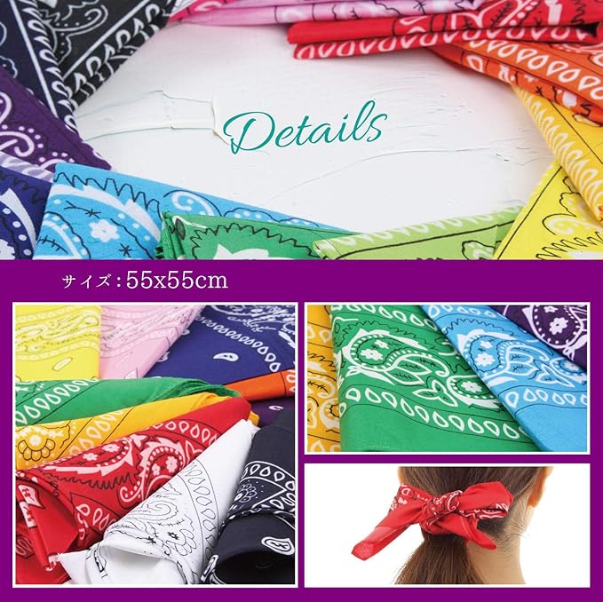 ③[シーンを選ばない万能アイテム] ハンカチ、ヘアバンド、スカーフ、三角巾、ペットのファッションアイテム、帽子などマルチに活躍するバンダナです。災害時にはロープや目印として使用する事が可能。子供からお年寄りまで幅広い年齢層にお使い頂けます。
