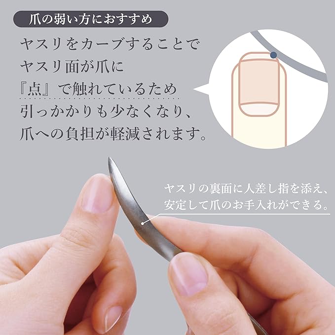 ●湾曲面にヤスリの目立てを施すことで、抵抗力を外に放出。嫌な引っかかりが少なく、非常に優しい削り心地で爪への負担を軽減してくれます。