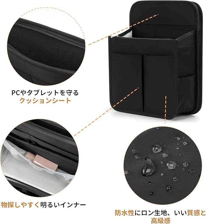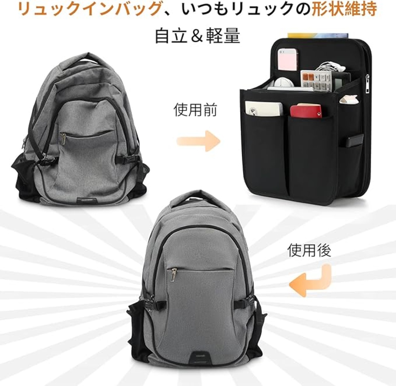 【超軽量】バックインバックは自立している分、多少に重さが感じますが、持ち運びなら気にならない程度です。リュックの重さをそれほど変わらないので持ち運びにも苦労しません。バッグからバッグへの入り替える簡単で、ママバッグとしても便利です。【側/後ろにチャックあるリュック】側に日常小物を入れるポケット6つあり。口金リュックの両側スペースにも機能させるし、側/裏にチャックが付いたリュックの中身出し入れもやすくなります。通勤通学、海外旅行など、途中で使う小物が多い場合に適しています。