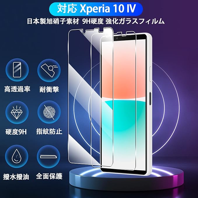 【日本製素材旭硝子製・耐衝撃性、飛散防止でさらに安心!】 対応 Xperia 10 IV 保護フィルム 日本製旭硝子素材、9H硬度。ポケットの中の鍵やコインなど、様々なものからスマートフォンを保護します。 またハードコーティング技術により、強度を普通より3倍以上アップしており、により外部からの衝撃をフィルムが吸収し、画面へのダメージを最低限まで抑えました。防爆、耐スクラッチ性、落下防止。特殊な飛散防止設計により、万一割れてしまった際にも飛散することなく、高い安全性を実現します。長く安心して使えます。