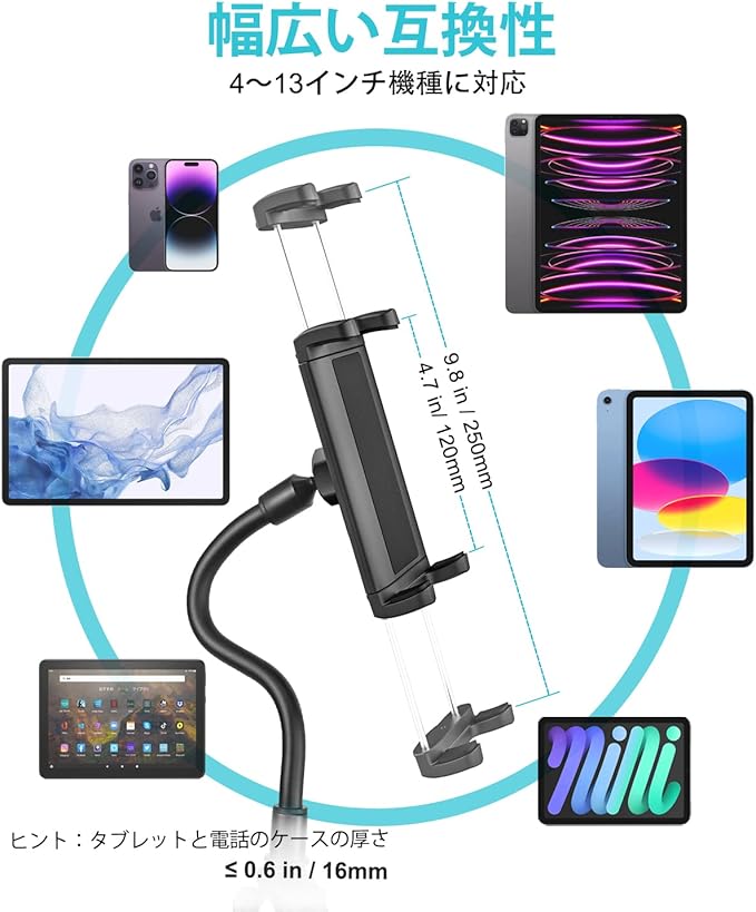 【丈夫で曲げやすいグースネック】アップグレードされたアルミニウムコアで作られており、高品質のABSプラスチックで包まれており、より強く安定しています。アームの長さ: 10.7インチ (27cm)。クランプには滑り止めシリコンパッドのデザインがあり、保護できます。 タブレットに傷がついたり、落ちたりするのを防ぎます。