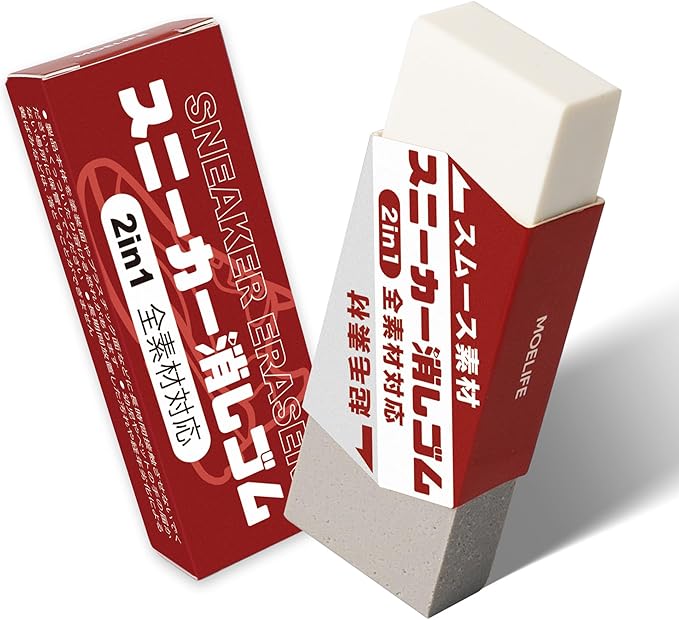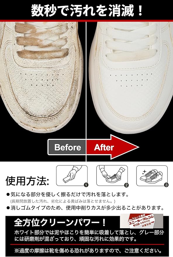 【汚れだけを落とす・スニーカーをキレイに】スニーカー専用の消しゴムを使うと、汚れだけを効果的に吸着し、すぐにキレイにします。靴に優しく、常に美しい状態を保つことができます。汚れを落とすには適度な摩擦が必要ですが、消しゴムタイプのため、削りカスがかなり出ることがあります。※長期間放置した汚れや経年劣化による黄ばみなどは落とせません