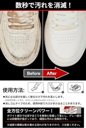 【水/洗剤不要・手軽に使える】水も洗剤も要らない手軽なスニーカークリーナーとして、気になる部分をさっと擦るだけで汚れを落とします。また、靴のアッパーだけでなく、先ゴム、廻しテープ、ヒールパッチなどの細かいところの汚れも簡単に取り除きます