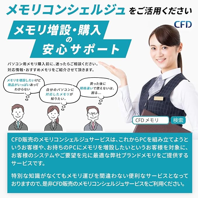 【安心その1】 ご購入前にお使いのパソコン環境で対応するメモリがわからないといったご不安に関しましては、CFDメモリコンシェルジュサービスをご活用ください! お客様の環境に合うメモリをお調べさせて頂きます。
