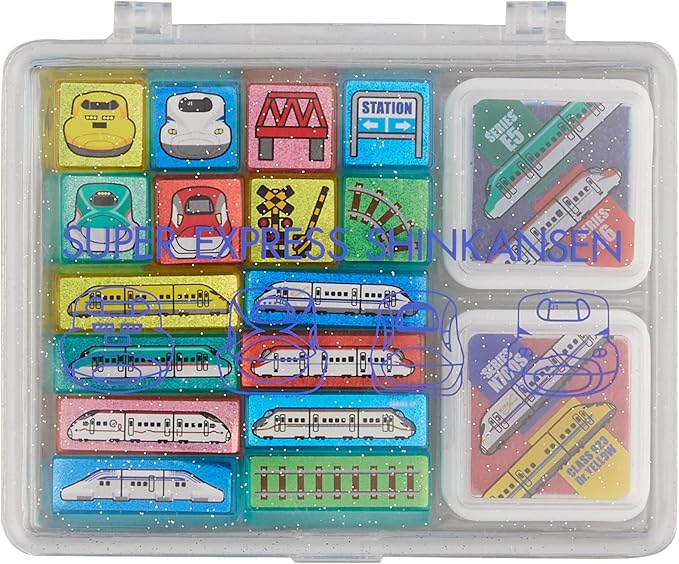 <スタンプの絵柄> 正方形スタンプ ・ドクターイエロー・N700S ・E5系・E6系 ・鉄橋・駅 ・踏切・線路(カーブ) 横長スタンプ ・ドクターイエロー・N700S ・E5系・E6系 ・800系・E7系 ・L0系・線路 <セット内容> 正方形スタンプ8個 横長スタンプ8個 スタンプパッド青1個 スタンプパッド赤1個