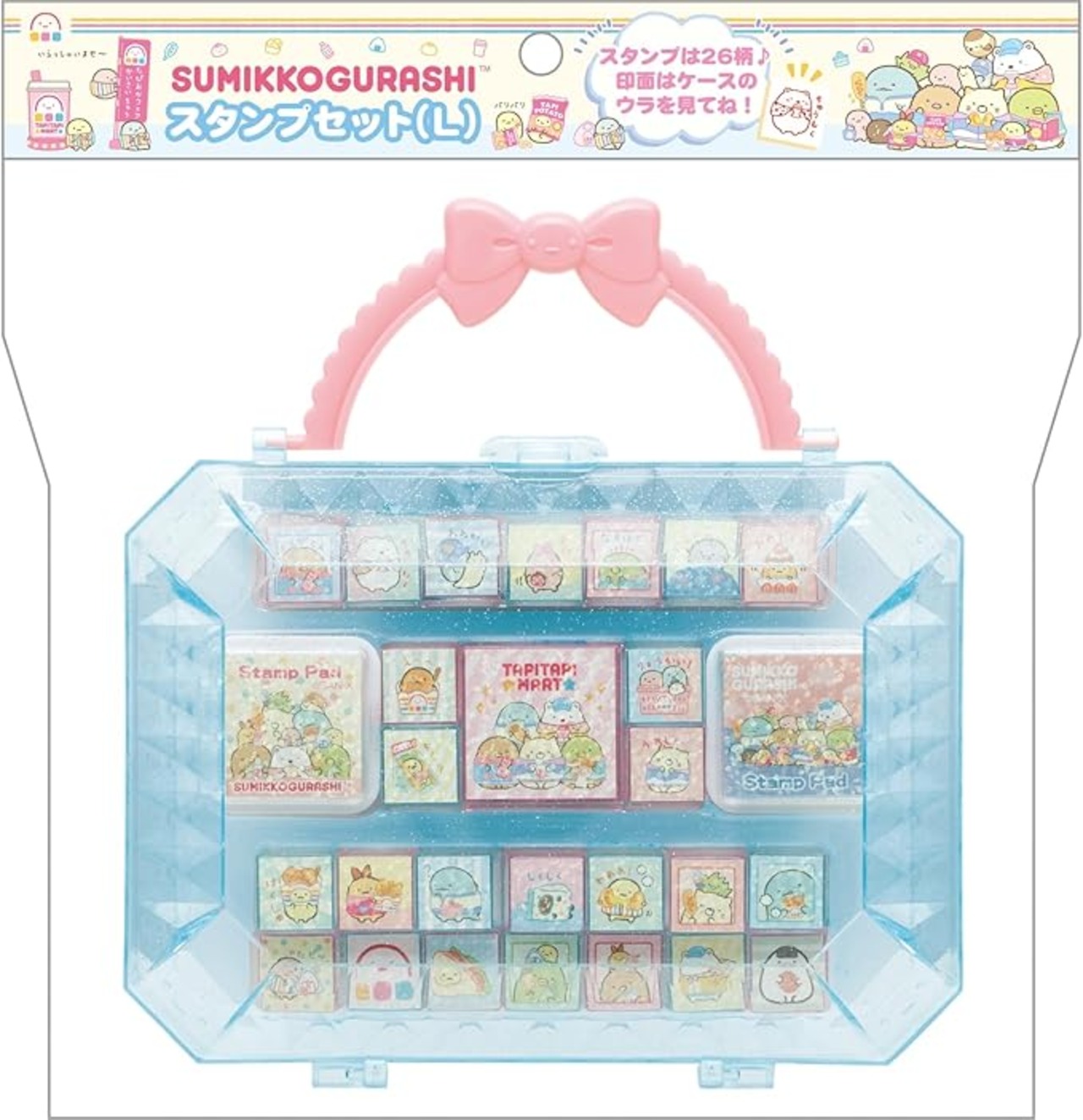 すみっコぐらしのスタンプセットが登場。スタンプ26個入り。リボン型の持ち手やたぴおかフェイスの留め具がかわいい。ケースはキラキラのダイヤカット♪ケースは小物入れとしても使えるよ。