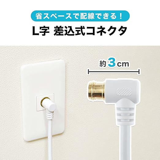 L字差込式コネクタは、狭い隙間にあるアンテナコンセントへの接続に最適です。機器にはもう一方のネジ式コネクタでしっかりと接続ができます。