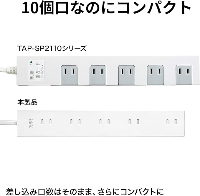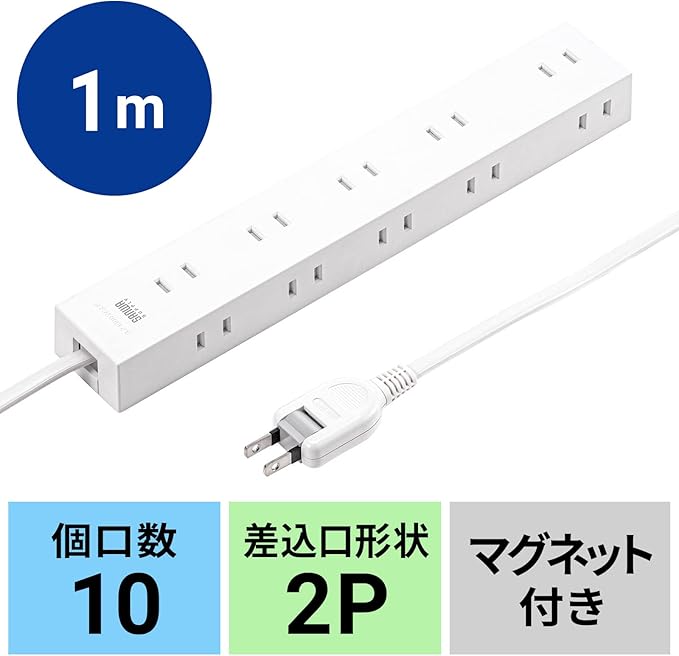 サンワサプライ(Sanwa Supply) 電源タップ 10個口・2P (1m) たくさん挿せるレイアウト 強力ネオジムマグネット ほこりシャッター スイングプラグ ホワイト TAP-2210-1W