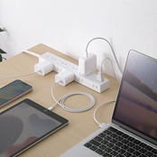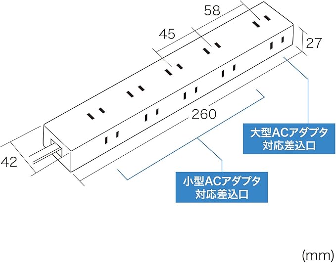 ●差込口は45mmピッチで小型ACアダプタが10個接続可能です。iPadなどのタブレットの充電器接続に便利です。1箇所はピッチが58mmと広く、大型のACアダプタが設置可能です。