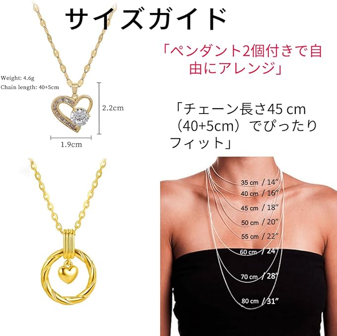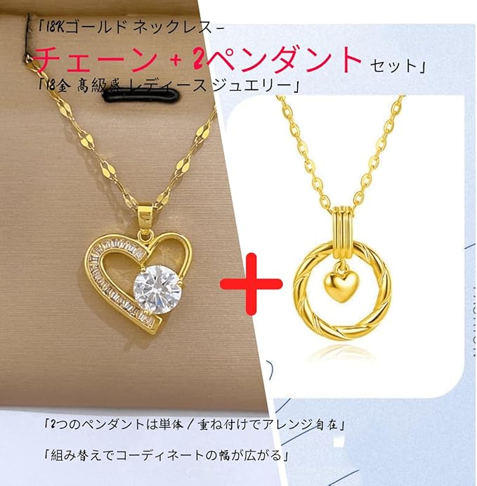 18K ゴールド ネックレス レディース ( チェーン+2 ペンダント セット) – 18金 ゴールド チェーン ジュエリー 母の日 誕生日 プレゼント に エレガントで