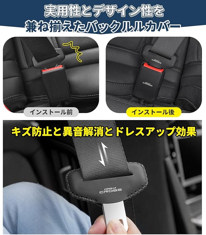 【異音対策&キズ防止】このシートベルトカバーは、シートベルトを外した際にバックルがBピラー(車体側面の柱部分)にぶつかることで発生する「ガタガタ音」や擦りキズをしっかり防止します。バックル本体のキズやサビも防ぎ、車内の美観を長く保ちたい方におすすめです。適用車種:カローラ クロス COROLLA CROSS 10系に適用します。