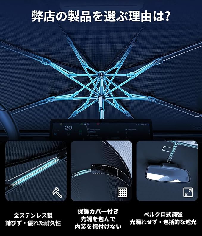 【拡大したサイズ・優れた耐久性】このカーサンシェードは、拡大されたサイズで、より包括的に光を遮断します。車内に光が漏れないようにして内装の劣化に対するより包括的な保護を提供します。そして、この車用日除け傘の傘骨は全ステンレス製で、錆びにくく耐久性に優れています。※本商品の長さと幅は143*77.5cmです。ご購入前にお愛車のフロントガラスのサイズが適合するかどうかご確認ください。