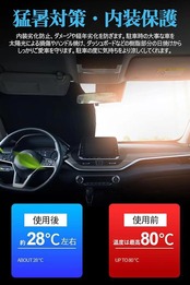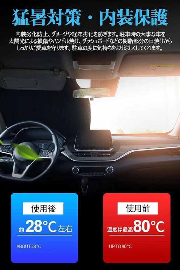 【猛暑対策・内装保護】このサンシェードは 内装劣化防止、ダメージや経年劣化を防ぎます。駐車時の大事な車を太陽光による損傷やハンドル焼け、ダッシュボードなどの樹脂部分の日焼けからしっかりご愛車を守ります。駐車の度に気持ちをより涼しくしてくれます。