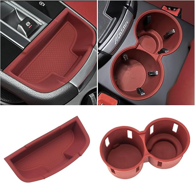 For ポルシェ マカン カスタムパーツ ドリンクホルダー 保護カバー コンソール収納ボックス保護マット,ポルシェ グッズ, マカン カスタム アクセサリー, シリコン防水保護マット よごれ防止 洗いやすい 車内はきれいだ 自主開発設計 (2個赤い for マカン 2022-2024)
