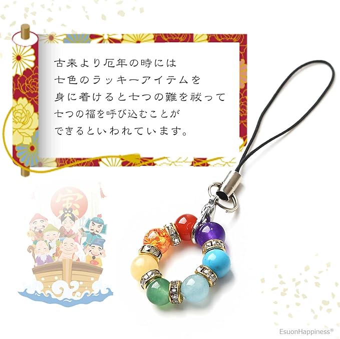 [EsuonHappiness] 天然石 パワーストン 七色 お守り リング 携帯 ストラップ 七色厄除け 開運グッズ 厄年 贈り物