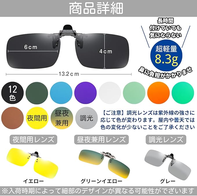 【クリップオン式で簡単装着】先進的なクリップオンデザインにより、既存の眼鏡に簡単かつ迅速に取り付け可能です。跳ね上げ式機能により、サングラスを使用したい時だけ下ろして使用し、必要ない時は上げておくことができます。この便利なメカニズムは、アクティビティ中でも素早い視界の調整を可能にします。