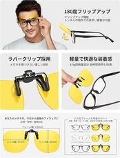 夜間運転専用イエローレンズクリップサングラス。わずか8.9gの超軽量設計で、メガネに簡単装着可能。跳ね上げ機能付きで片手操作でき、夜間の視認性向上と対向車の眩しさ軽減を実現。特殊ゴム製ヘッドでメガネをしっかり保護し、滑りにくい安定装着。雨天・曇天時にも効果的で、近視・老眼・遠視の方に最適(推奨サイズ:131 51mm以下)。収納袋・ハードケース・メガネ拭き・偏光テストカード付属の充実セット。
