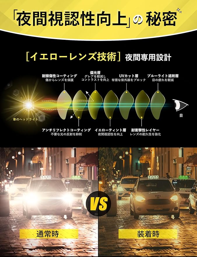 【夜間専用レンズ】イエローレンズ採用により、夜間運転時に周囲の車両や信号灯が鮮明に見え、明度が向上し視認性が大幅にアップします。雨天・雪道での運転時も、対向車からの乱反射光や眩しさを効果的に軽減し、安全な視界を確保します。